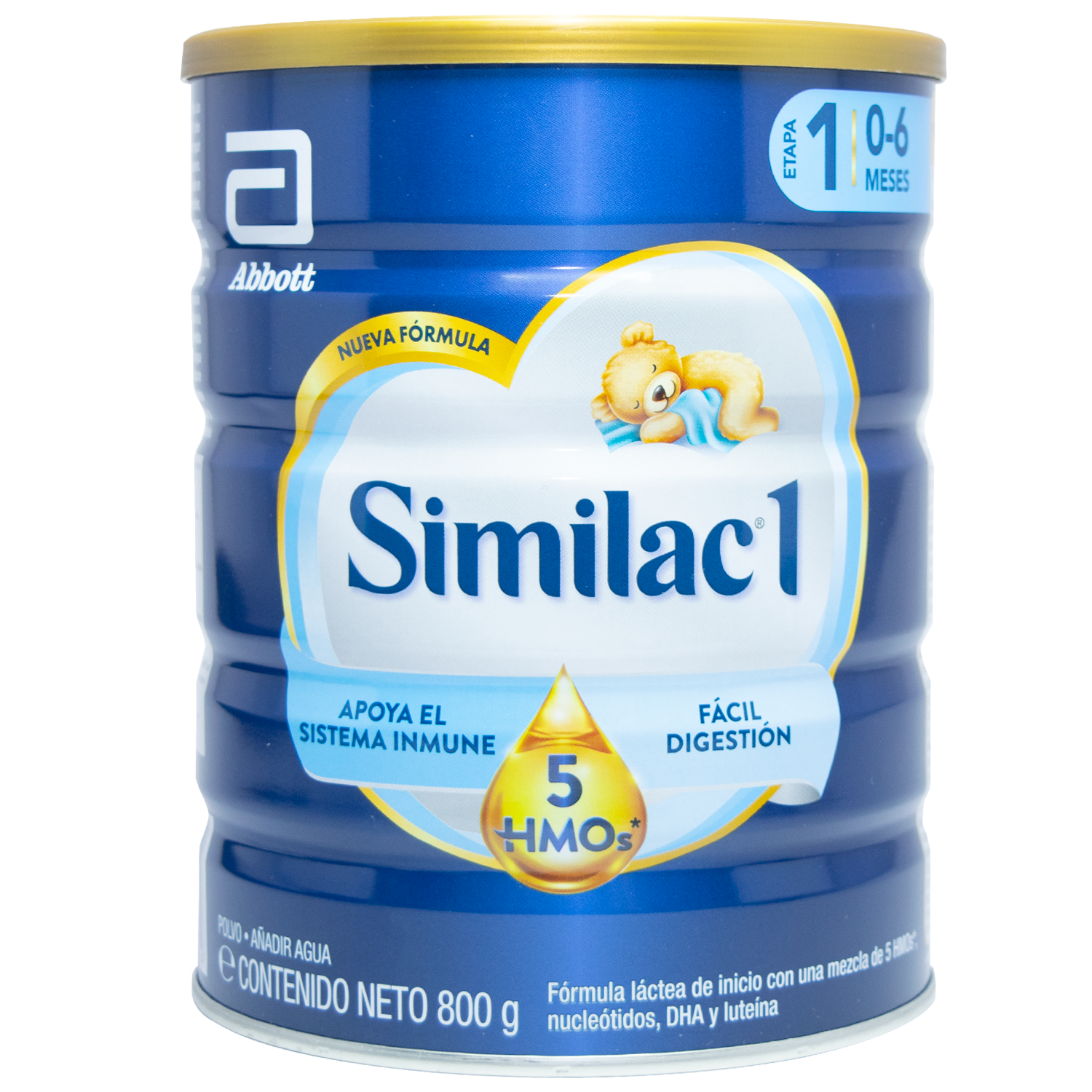 Fórmula láctea de continuación con una mezcla de 5HMO, nucleótidos, DHA, luteina.